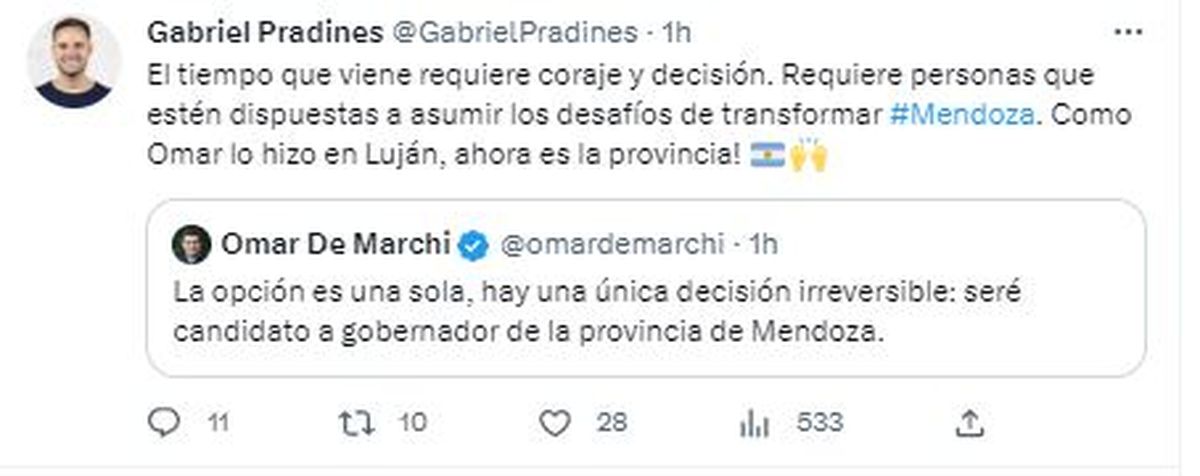 La salida de Omar De Marchi del frente Cambia Mendoza era un secreto a voces durante las últimas semanas. "La opción es una sola, hay una única decisión irreversible: seré candidato a gobernador de la provincia de Mendoza", lanzó por Twitter el lujanino apenas pasadas las 15 de este martes, y las repercusiones no se hicieron esperar.