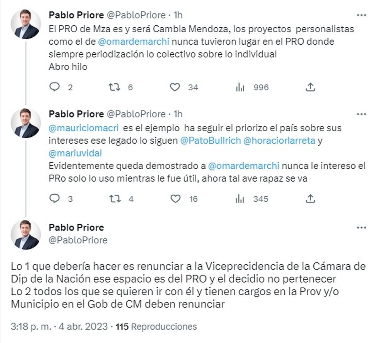 Entre los mensajes más encendidos estuvieron los de algunos de sus excompañeros de camino en el PRO de Mendoza, como el senador provincial Pablo Priore, que pidió que todos los que tienen cargos y quieran irse con De Marchi "deberían renunciar".