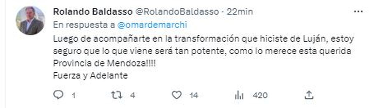 Pero no todas fueron críticas. El presidente del bloque PRO en el Senado provincial, Rolando Baldasso, dijo que para De Marchi y su equipo lo que viene "será tan potente como lo merece esta querida provincia". Con ello, evidenció que existen profundas diferencias dentro del partido.