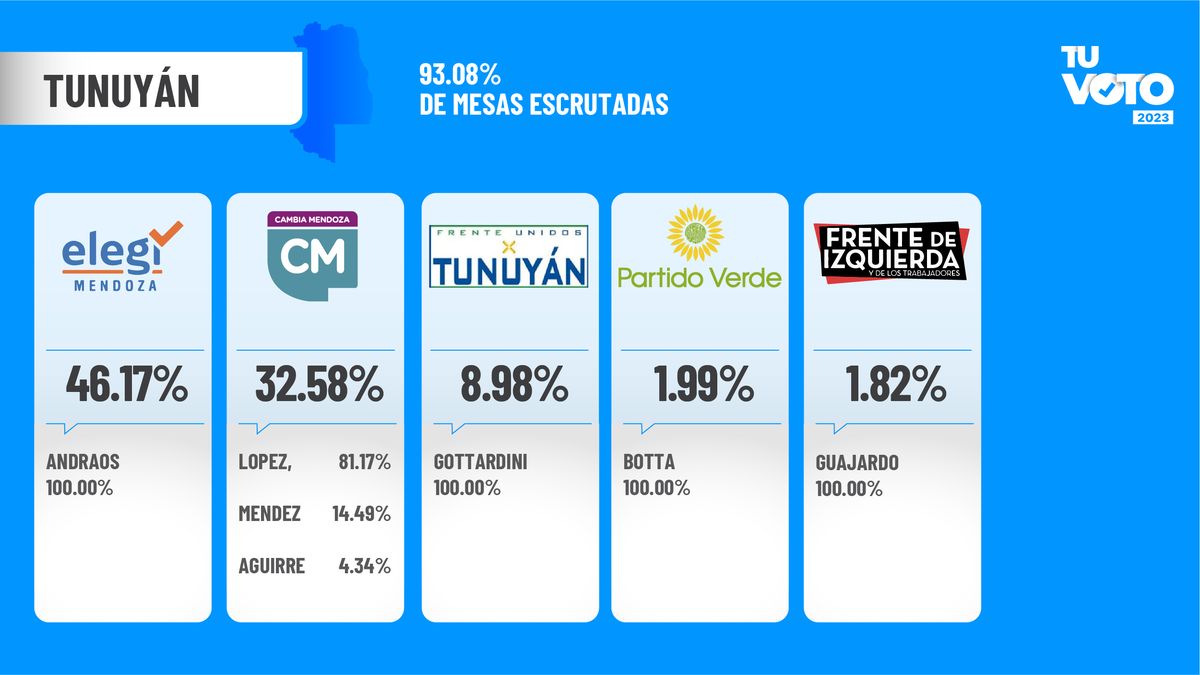 En Tunuyán, donde gobierna Martín Aveiro, quien es precandidato a concejal, Emir Andraos se impone con el 46.17% de los votos por sobre el 32.58% de Cambia Mendoza.
