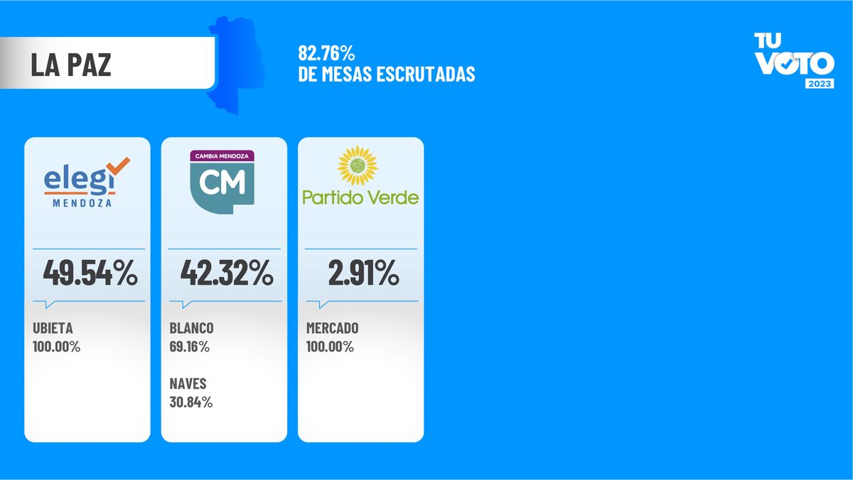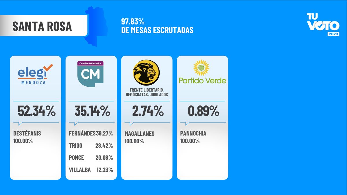 El frente Elegí suma 49.54%; mientras que el frente Cambia Mendoza suma 42.32%. Dentro de la interna opositora, se impuso ampliamente Ramiro Blanco.