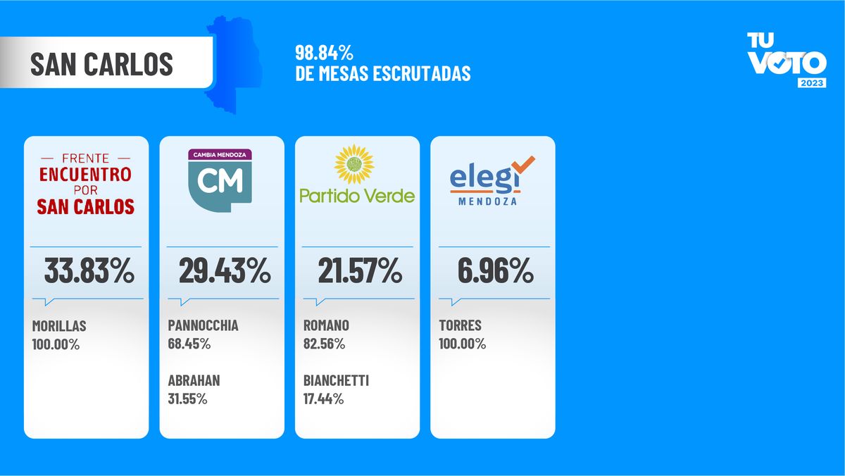 En San Carlos, cuando está escrutado más del 98% de los votos, el frente Encuentro por San Carlos de Jorge Difonso y el intendente Rolando Scanio, se impone con el 33,83%. Su precandidato es Alejandro Morillas.