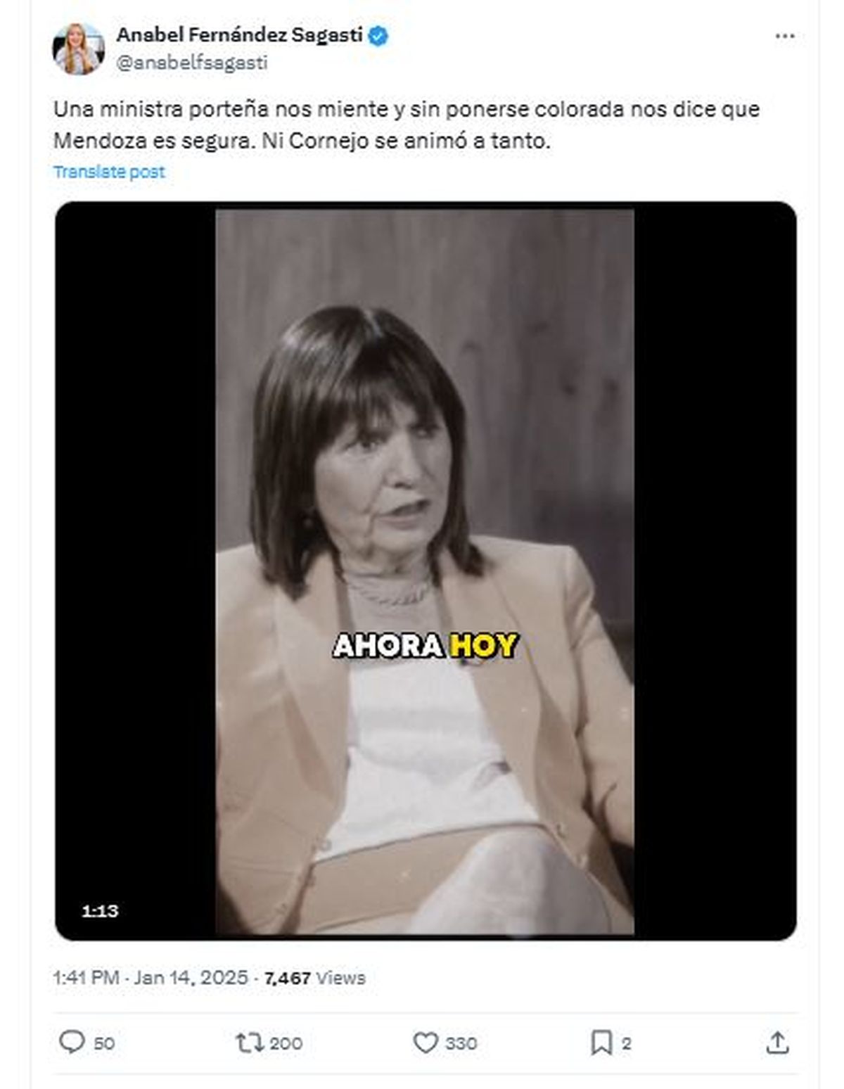 La sola afirmación de Patricia Bullrich encendió la crítica de la senadora nacional kirchnerista, Anabel Fernández Sagasti, quien usó sus redes sociales para marcar: "Una ministra porteña nos miente y sin ponerse colorada nos dice que Mendoza es segura".