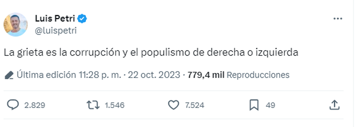 Tras la derrota electoral, Luis Petri se manifestó a través de las redes sociales. En ese momento, la postura fue contra el "populismo de derecha o de izquierda".