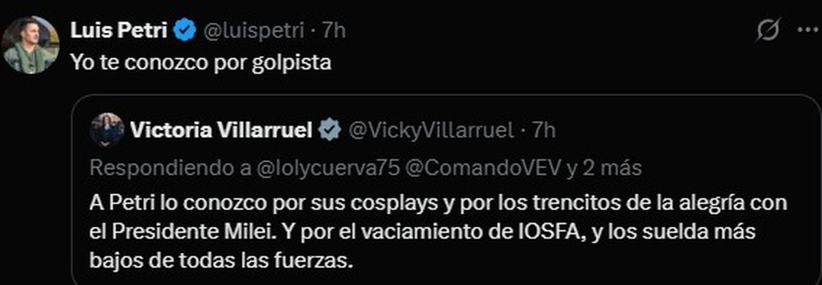 En un intercambio posterior con usuarios de la red, Villarruel redobló la apuesta contra el binomio presidencial: “A Petri lo conozco por sus cosplays y por los trencitos de la alegría con el presidente Milei”. Ante esto, el diputado mendocino replicó con una acusación directa: “A vos te conozco por golpista”.