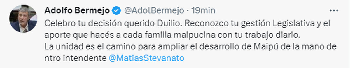 Stevanato, en efecto, expresó: "En equipo este Maipú crece. Duilio Pezzutti: gracias por continuar con el legado de unidad, diálogo y trabajo que siempre caracterizó al peronismo maipucino".
