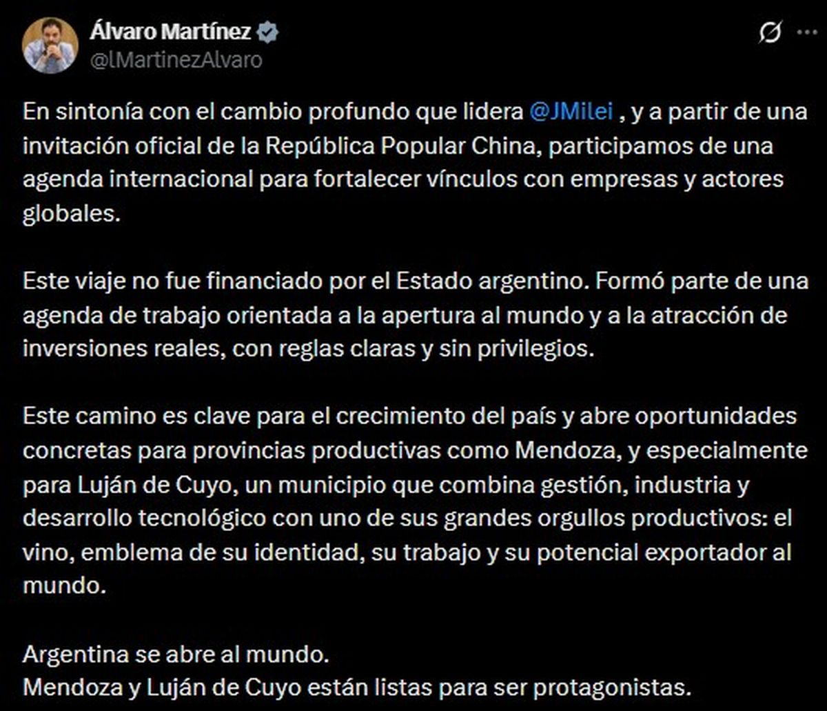 Este jueves Álvaro Martínez -reelecto en las elecciones de octubre, con mandato hasta 2029- aclaró que "este viaje no fue financiado por el Estado argentino" y también dio detalles de las reuniones que sostuvieron: "Participamos de una agenda internacional para fortalecer vínculos con empresas y actores globales".
