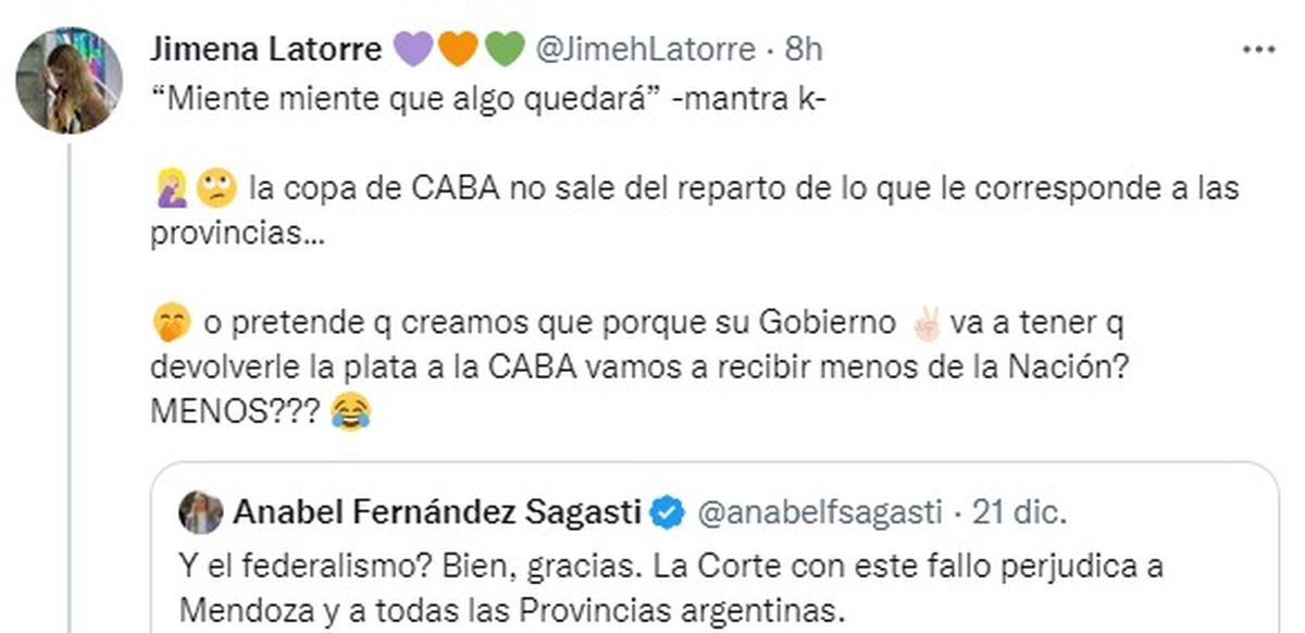 Y es también, la visión de la diputada nacional Jimena Latorre (UCR) que arremetió contra Sagasti en las redes: