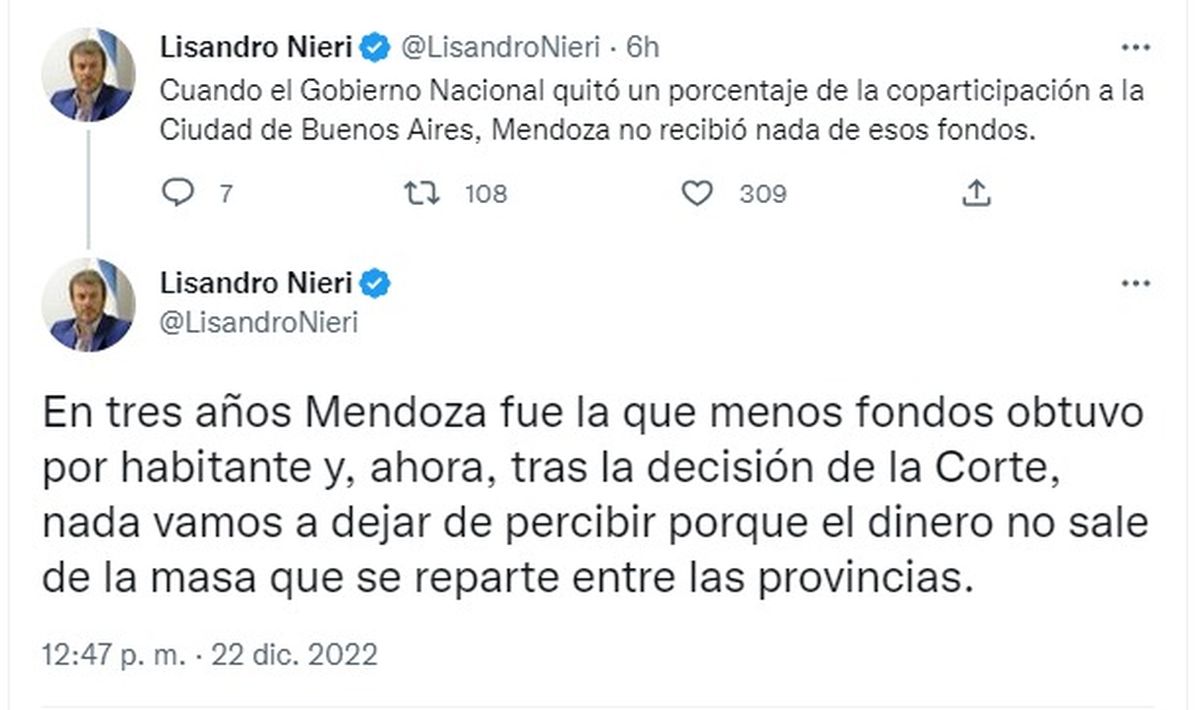 El fallo de la Corte Suprema de Justicia que ordena darle a la Ciudad de Buenos Aires (CABA) el 2,95% de la masa de impuestos coparticipables trazó una línea filosa en la política mendocina durante la tarde de este jueves. El eje de la discusión estuvo en definir si el cambio en la distribución de la coparticipación afecta o no a la provincia. Y si la Nación acatará o no el fallo.