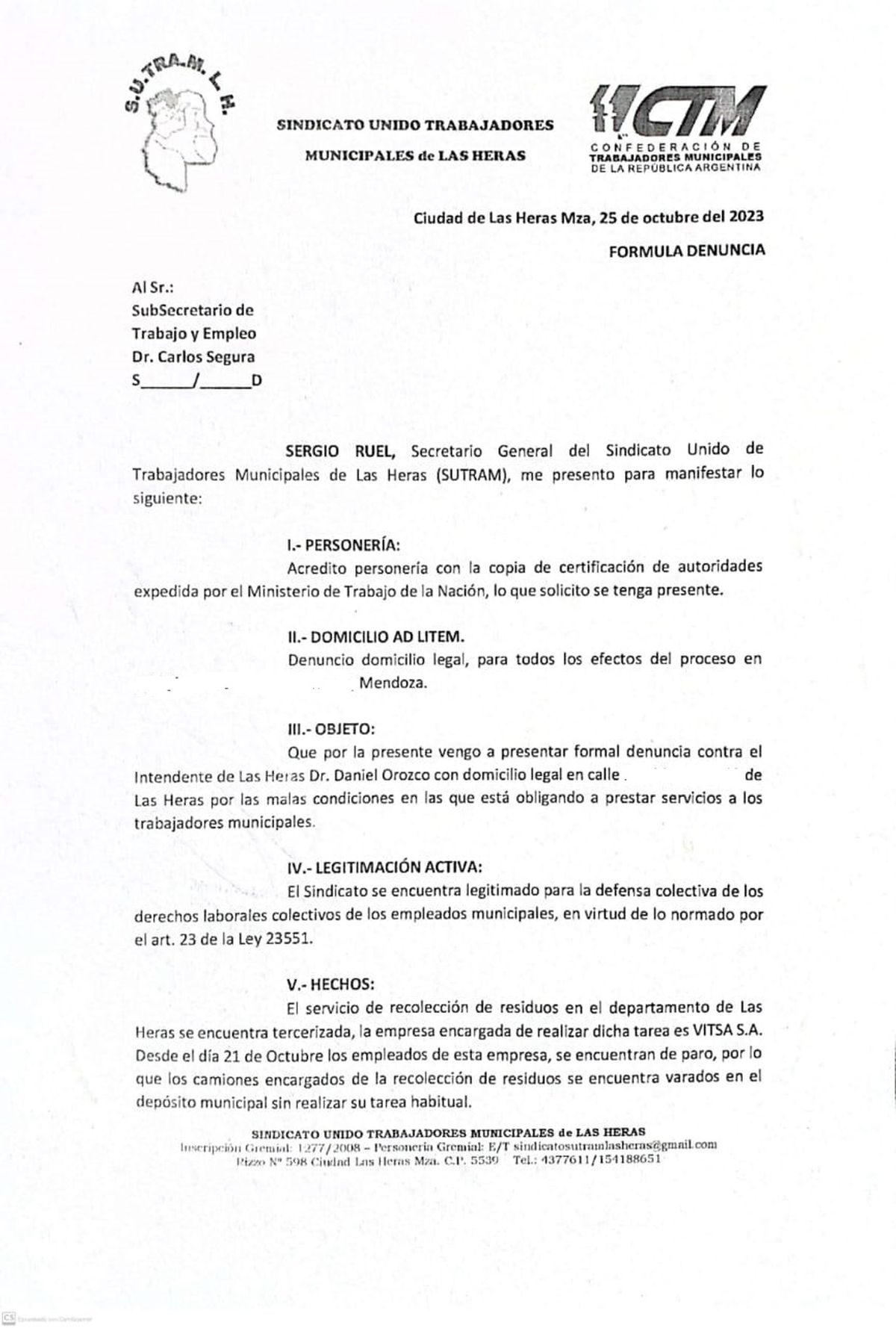 Quien presentó la denuncia fue Sergio Ruel, el secretario general de SUTREM. En los fundamentos explica que el servicio de recolección de basura en Las Heras está tercerizado y su realización a cargo de la empresa Vitsa, cuyos trabajadores están de paro.