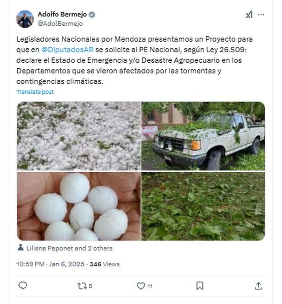 Por los daños que dejaron el granizo y el viento, Adolfo Bermejo, Martín Aveiro y Liliana Paponet pidieron esa asistencia a la Nación. Los respaldó Julio Cobos