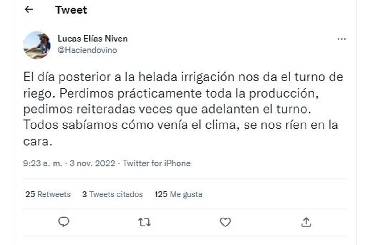 "Los que tuvieron riego disponible hoy registran un daño del 10% y nosotros que no tuvimos agua hemos perdido más del 70% en las fincas que tenemos en San Martín y Junín. Nosotros fuimos de los que pedimos agua a los inspectores de cauce y no quisieron ceder, mandaron el agua al día siguiente como riéndose de nosotros en la cara. Si la hubieran mandado hoy no tendríamos que estar pidiendo ayuda ni subsidios al Estado", denunció Lucas Niven y reflejó su enojo en sus redes sociales. Niven es enólogo y productor vitícola de Junín. También junto con su familia, son propietarios de una bodega.