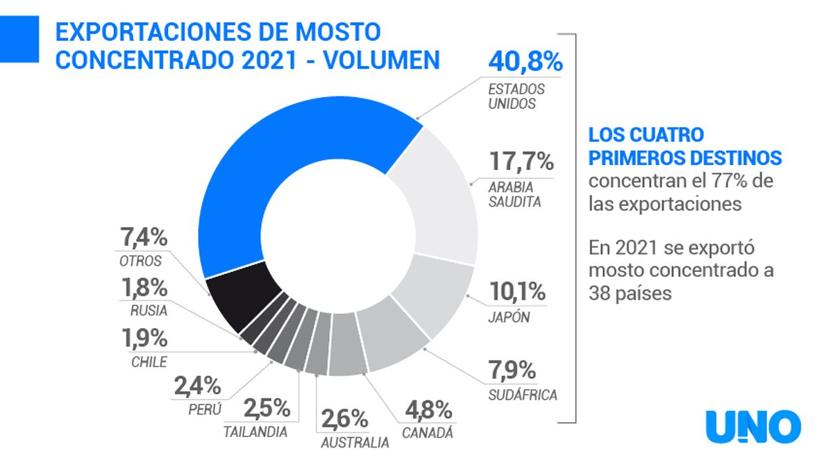 De confirmarse esos aranceles, la industria mostera perdería al principal mercado al que exporta mosto. Según los números que maneja el Instituto Nacional del Vino (INV) Estados Unidos es el principal comprador de mosto argentino, ya que en el 2021 adquirió el 40% de lo que se exportó.