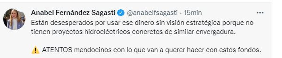 Incluso, la legisladora peronista fue más allá y apuntó contra el gobernador Rodolfo Suarez y Cornejo, a quienes acusó de no hacer nada en más de dos años por Portezuelo del Viento. "Deben estar festejando en silencio", se despachó en cuenta de Twitter. Y sumó sobre el uso de los fondos de Portezuelo del Viento, en total 1.023 millones de dólares: