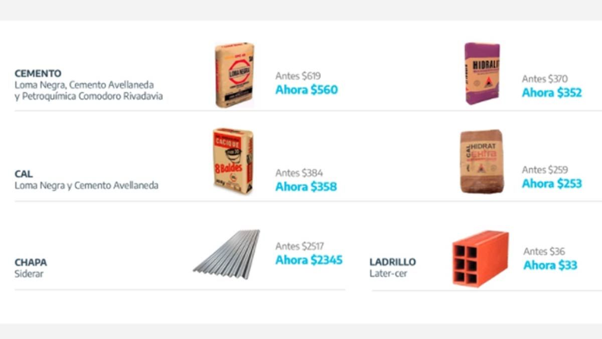 A continuación, algunos productos y sus precios comparados con la entrada en vigencia de Precios Cuidados para la Construcción