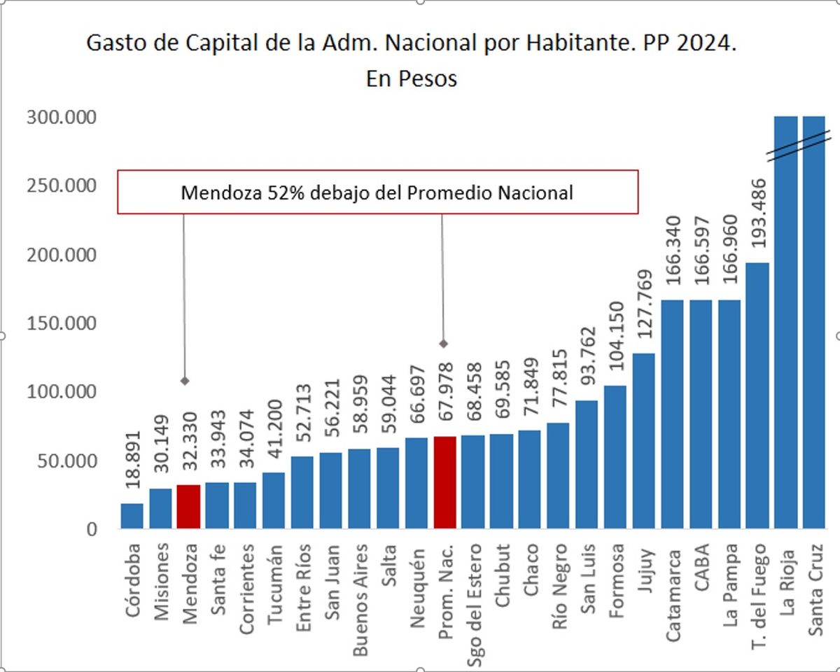 En comparación con las demás provincias de Cuyo, la diferencia es notable. En San Juan, la inversión es de más de $56.000 por habitante, mientras que en San Luis supera los $93.000 por habitante.