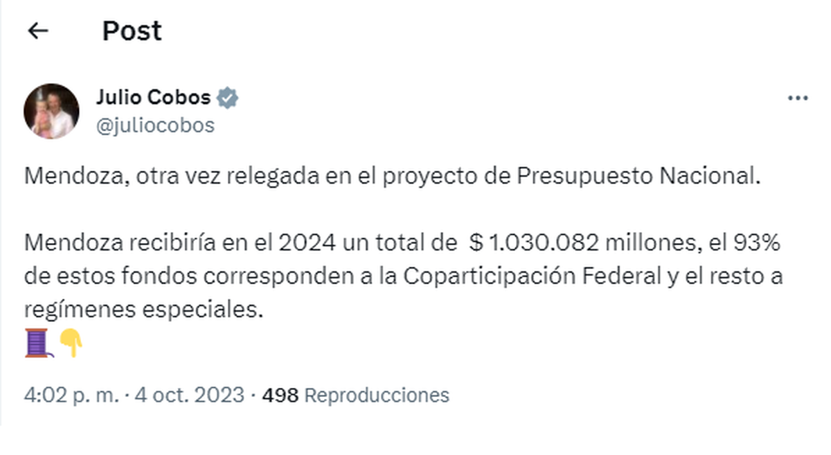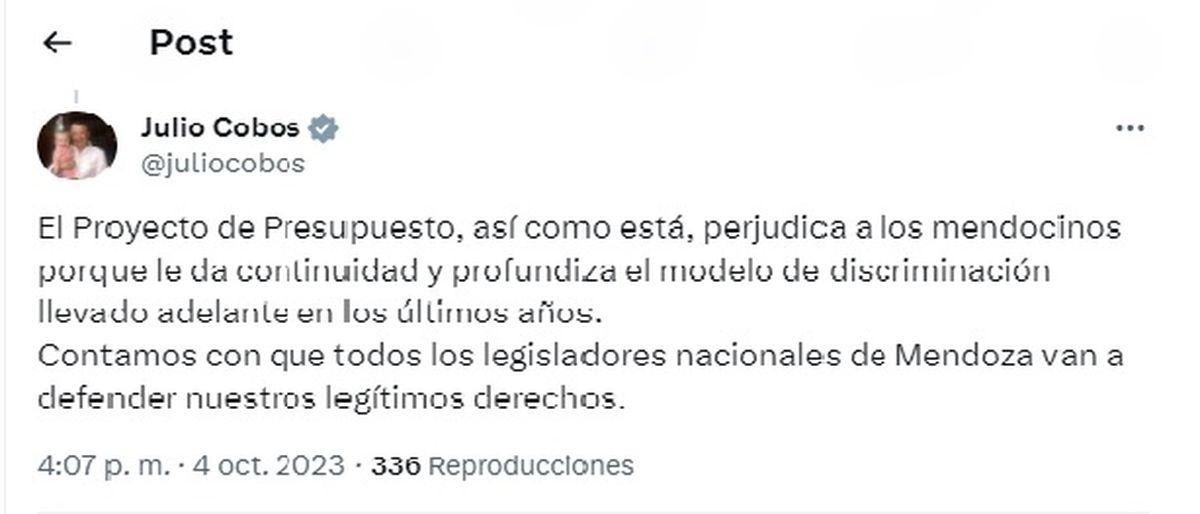 El primero en hacer público que Mendoza saldrá desfavorecida fue el diputado radical Julio Cobos, quien lo manifestó a través de sus redes sociales.