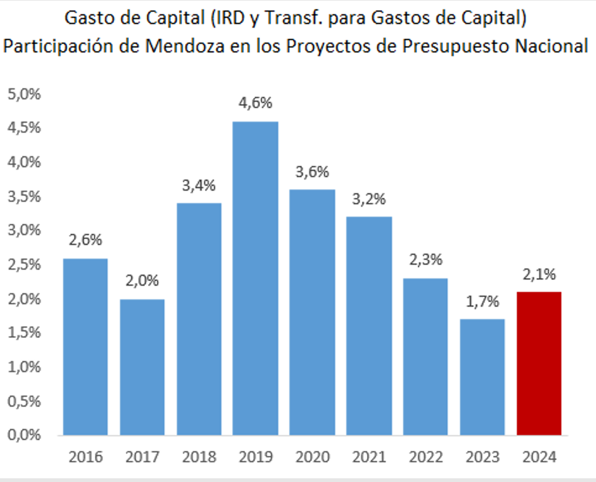 El promedio de participación que tiene Mendoza en los gastos de capital del Presupuesto Nacional es, en promedio, del 3%. Sin embargo, ha habido años, como el 2019, en el que ese porcentaje ha crecido, llegando al 4,6%. Mientras, en otros, como el 2023, esta participación ha sido muy baja, de menos del 2%