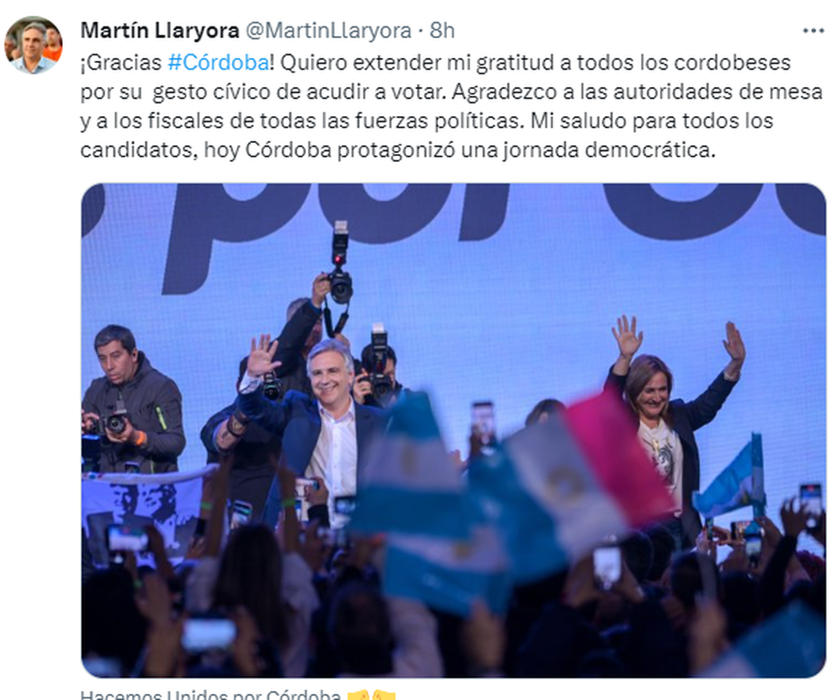 "A partir de diciembre vamos a trabajar para todos los cordobeses. Agradecemos por estos 24 años pero ahora empieza lo mejor, porque nosotros somos una nueva manera de hacer política, una nueva generación. Empieza otra provincia, una nueva era, haremos las reformas necesarias", remarcó desde su cuenta de Twitter.