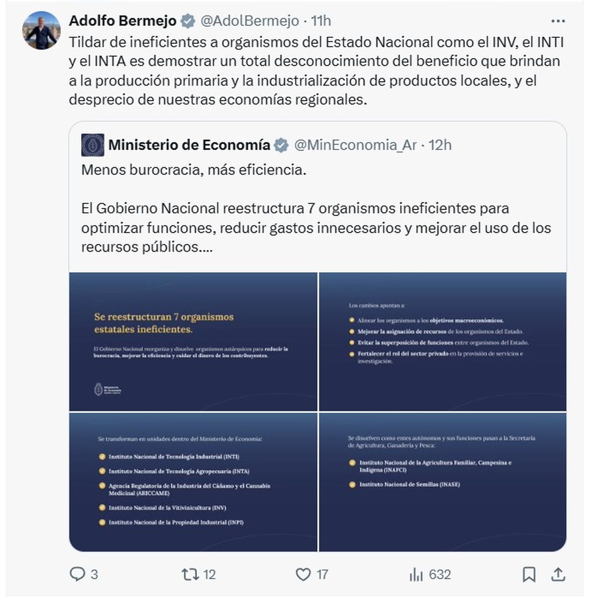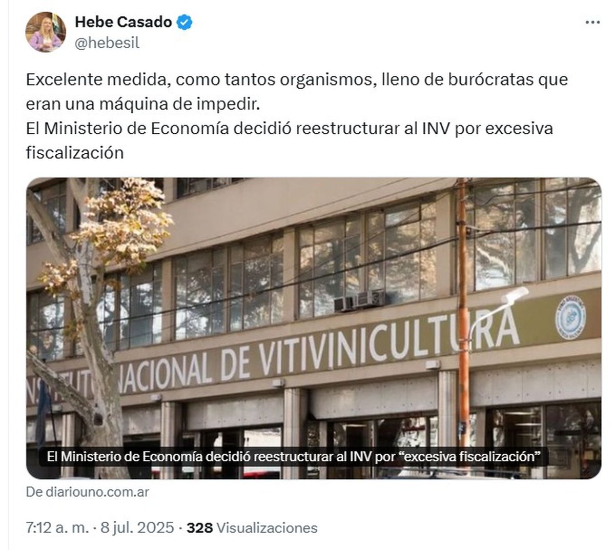 En sus redes la segunda autoridad de la provincia resaltó que el Instituto Nacional de Vitivinicultura que tiene su sede en Mendoza, estaba "lleno de burócratas que eran una máquina de impedir". Y por ende celebró que el Ministerio de Economía haya decidido reestructurarlo "por excesiva fiscalización".