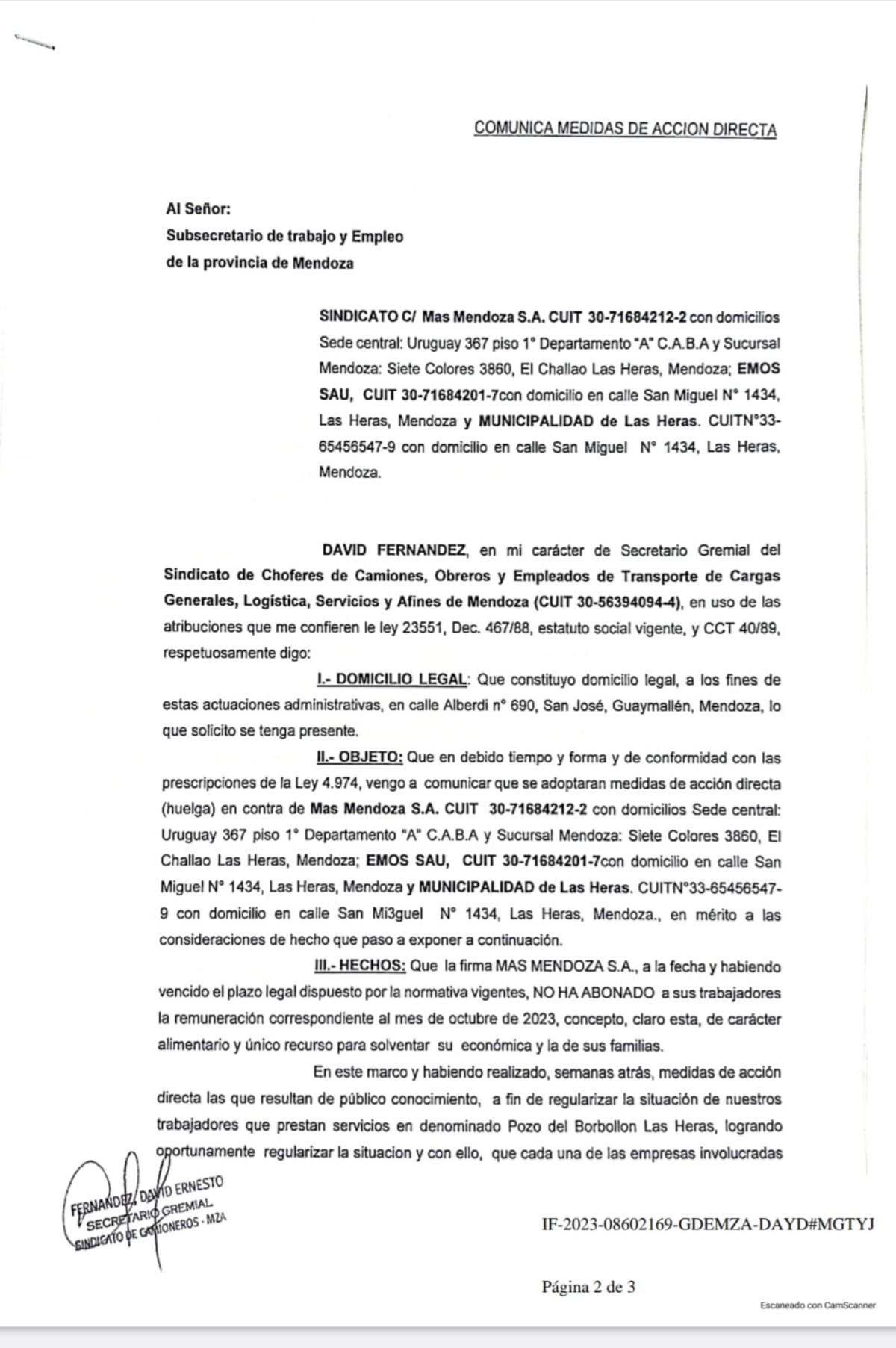 El texto, que lleva la firma del secretario gremial, David Fernández, especifica que a pesar de que en su momento se adoptaron "medidas a fin de regularizar la situación de nuestros trabajadores que prestan servicios en denominado Pozo del Borbollón, Las Heras", a la fecha no se han pagado los salarios prometidos cuando se resolvió aquel conflicto.
