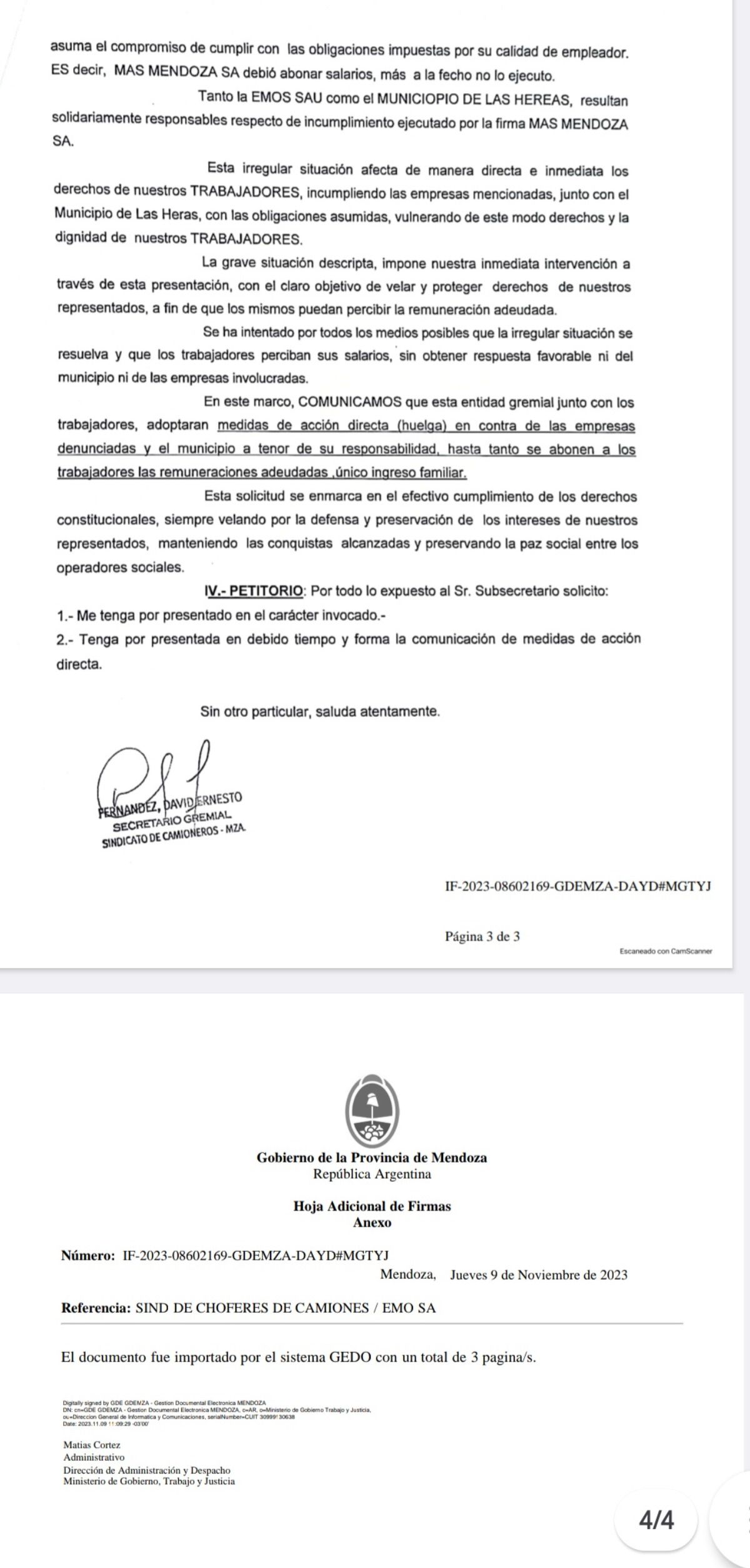 "Tanto EMOS S.A.U. como el Municipio de Las Heras resultan solidariamente responsables respecto al incumplimiento ejecutado por la firma MAS Mendoza S.A.", define el comunicado.