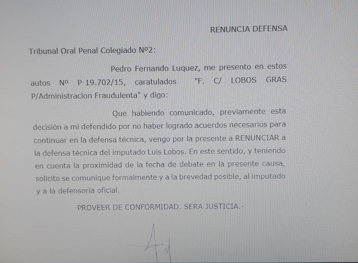 La renuncia de Lúquez se concretó este miércoles y quedó oficializada ante la Justicia a través de una nota en la que el letrado argumenta que "no se lograron los acuerdos necesarios para continuar ejerciendo la defensa técnica".