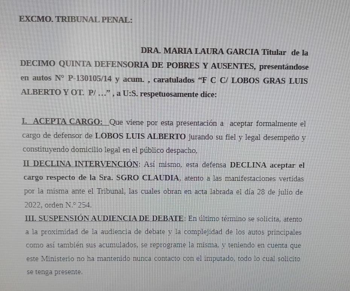 Así quedó manifestado por la defensora pública Laura García en el escrito de aceptación del cargo en favor de Luis Lobos.
