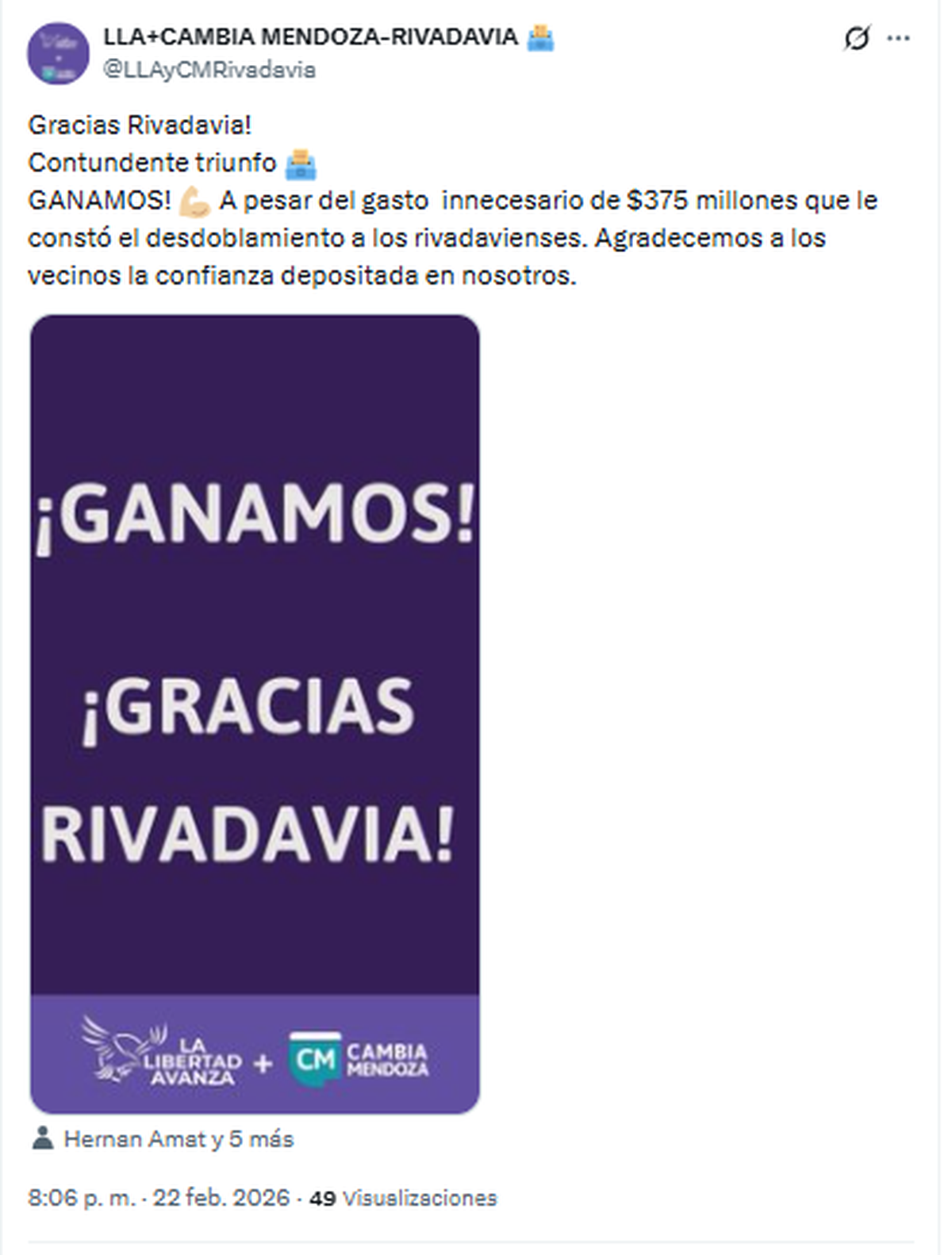 Tal fue el respaldo que cosechó la lista de los concejales de Ubieta, que el intendente salió a agradecerlo en sus redes y aseguró que la lista se quedó con el 54,86% de los votos.