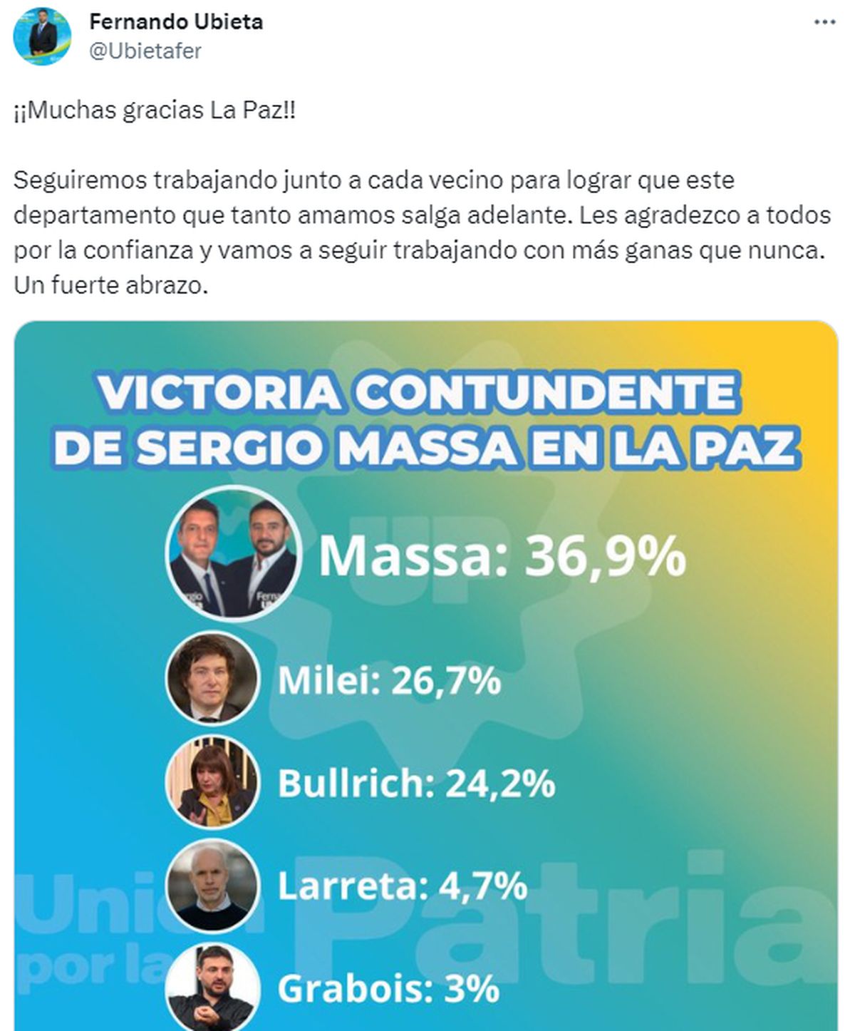 Fue el propio Ubieta el que destacó que en su municipio, el precandidato peronista obtuvo el 36,9% de los votos, por sobre el 26,7% de Javier Milei y el 24,2% de Patricia Bullrich.