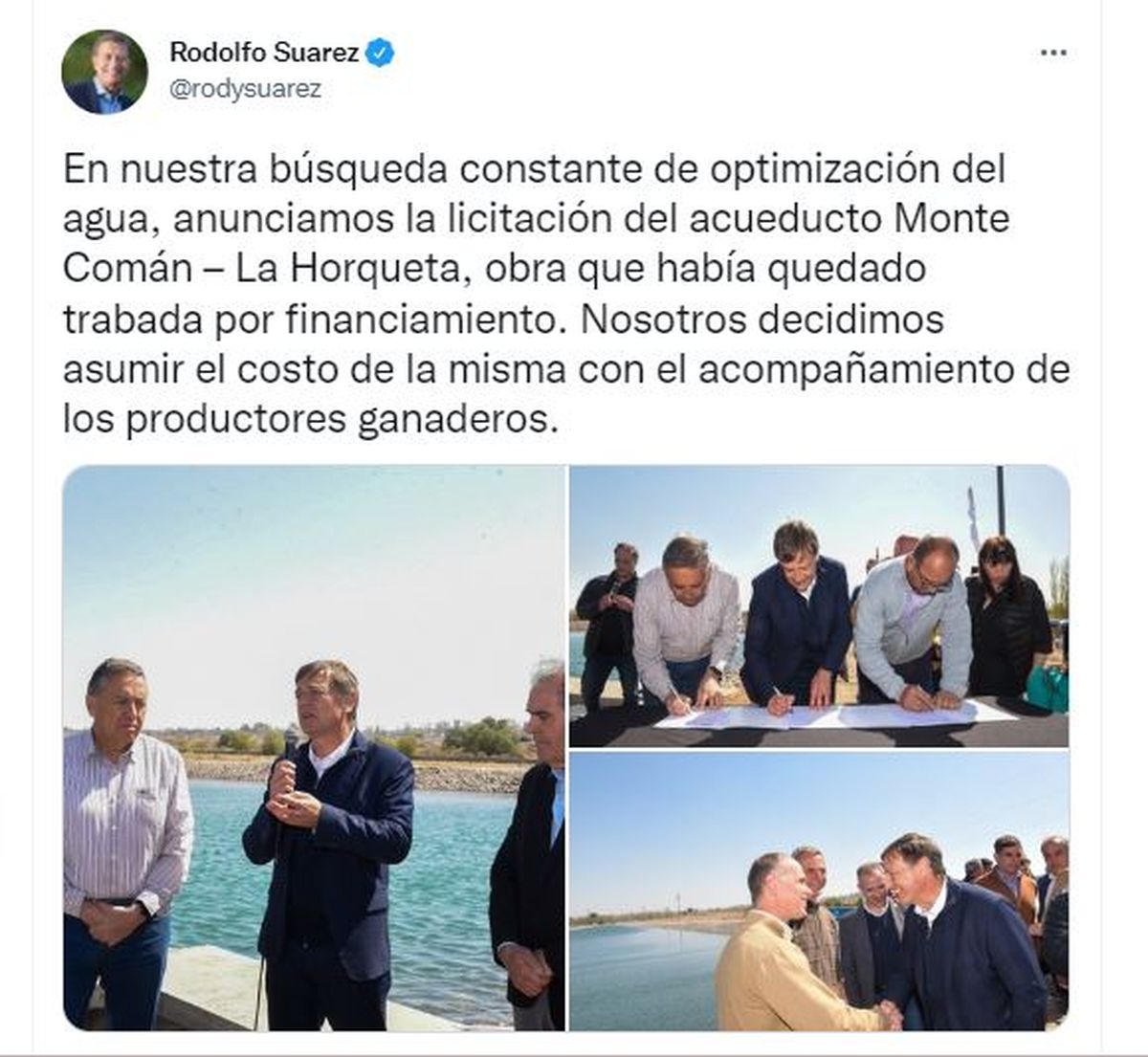 Rodolfo Suarez anunció que licitará el acueducto Monte Comán- La Horqueta con fondos provinciales