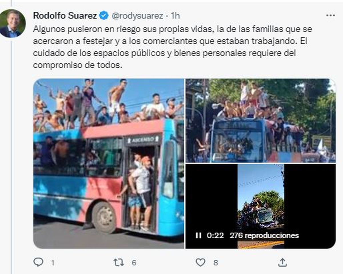 También indicó el titular del Ejecutivo: "Algunos pusieron en riesgo sus propias vidas, la de las familias que se acercaron a festejar y a los comerciantes que estaban trabajando. El cuidado de los espacios públicos y bienes personales requiere del compromiso de todos". A esta última afirmación la acompañó con imágenes de los micros tomados por aficionados, que sin medir consecuencias se subieron a los techos de los colectivos.