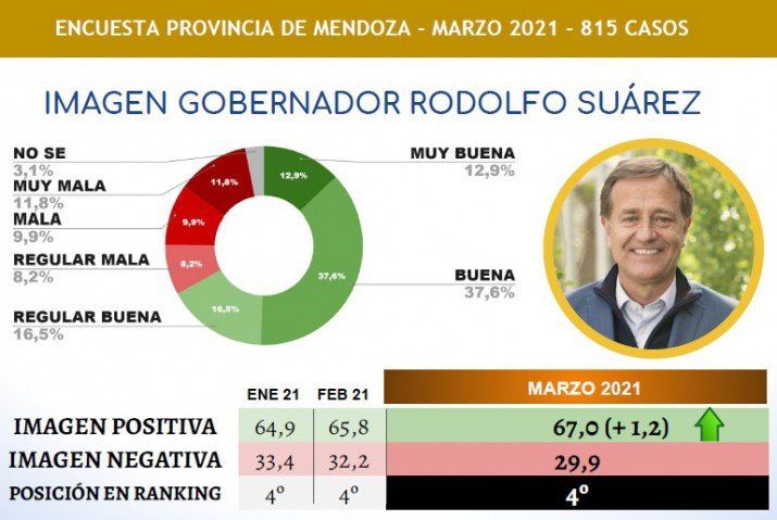 En el ranking de los gobernadores, el de Mendoza conservó el cuarto lugar pero mejoró su performance en más de un punto porque mientras en febrero la aprobación para el mandatario radical fue del 65,8%, en marzo llegó al 67%.