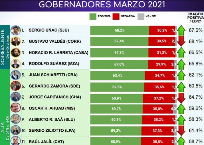 El que se mantiene primero en el ranking es el peronista sanjuanino Sergio Uñac, seguido por el radical correntino Gustavo Valdés y el hombre del PRO en la Ciudad Autónoma de Buenos Aires, Horacio Rodríguez Larreta.