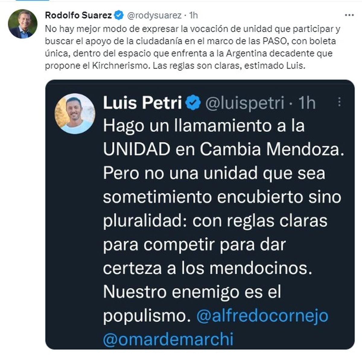 Ante eso, Suarez retrucó: "No hay mejor modo de expresar la vocación de unidad que participar y buscar el apoyo de la ciudadanía en el marco de las PASO, con boleta única, dentro del espacio que enfrenta a la Argentina decadente que propone el kirchnerismo. Las reglas son claras, estimado Luis".