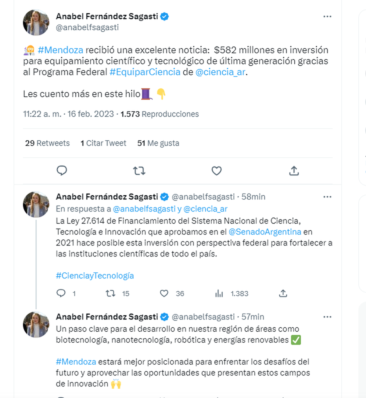 La vieja discusión sobre si la Nación relega o asiste a Mendoza con fondos tiene ahora un nuevo capítulo. Es que contrarrestando los reiterados reclamos provinciales, esta semana el Ministerio de Ciencia y Tecnología destinó a la provincia $582 millones para la compra de 11 equipos de investigación científico-tecnológica y la primera en festejarlo fue la senadora nacional Anabel Fernández Sagasti.