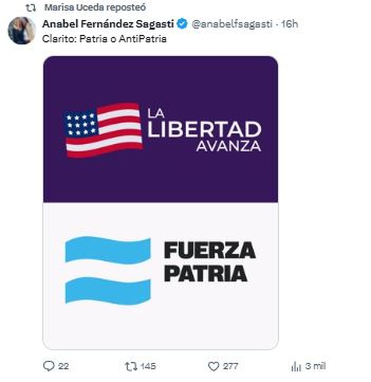 Como era de esperar el peronismo agitó la bandera de la soberanía nacional, y la senadora nacional kirchnerista, Anabel Fernández Sagasti fue contundente con un posteo que comparó las banderas de La Libertad Avanza y la de Fuerza Patria, con el texto de "Clarito: Patria o Antipatria".