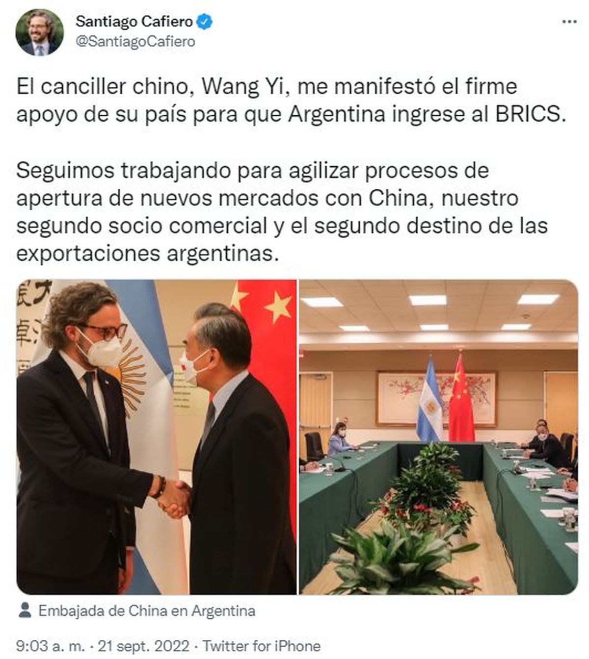 Tras el encuentro en el marco de la 77 Asamblea General de la ONU en Nueva York, donde tomó la palabra Alberto Fernández, Cafiero aseguró: "El canciller chino, Wang Yi, me manifestó el firme apoyo de su país para que la Argentina ingrese al BRICS", en un mensaje publicado en su cuenta de Twiter.