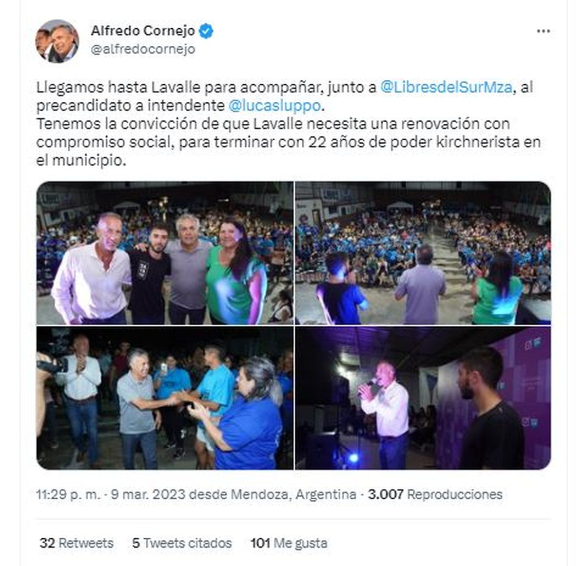 "Queremos hacer una elección que sea histórica para Lavalle desde el Frente Cambia Mendoza y los necesitamos", le dijo a la militancia reunida allí, y disparó: “hace 22 años que está la misma persona. Ya están gastados, viejos, enriquecidos, ya es bueno que cambien por un nuevo equipo como este joven abogado Lucas Luppo. Eso es renovación de Lavalle, eso es representar a la juventud, a la que sufre, a la que necesita oportunidades”.