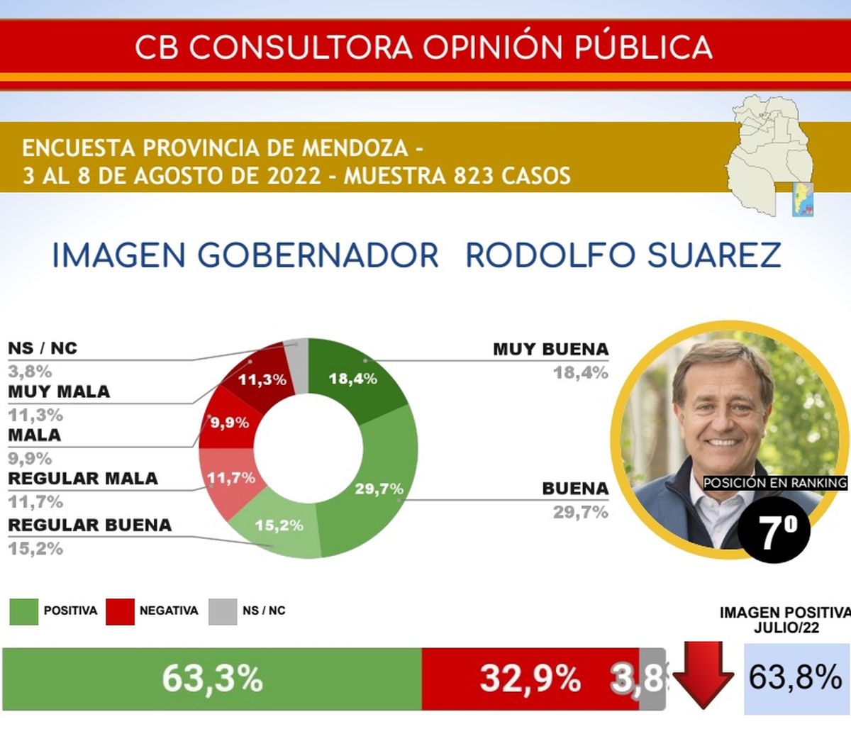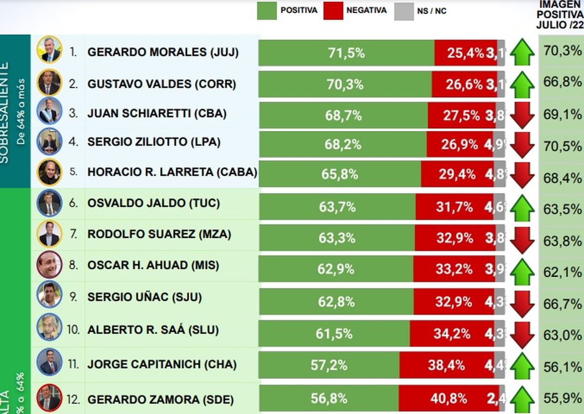 Con este último registro Suarez que supo liderar ese ránking de gobernadores en junio del 2021, cayó ahora al séptimo lugar, en la medición de esa consultora que este mes lideró el radical jujeño Gerardo Morales con el 71,5% de imagen positiva, seguido de atrás por otro correligionario, el correntino Gustavo Valdés quien se quedó con el segundo puesto con un 70,3%, y el podio se completó con cordobés Juan Schiaretti, que se alzó con un 68,7%.