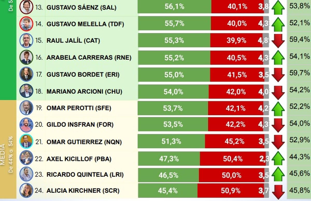 Entre los peores rankeados aparecen la mandataria de Santa Cruz, Alicia Kirchner, aventajando por escaso margen al gobernador de La Rioja, Ricardo Quintela, y al bonaerense Axel Kicillof, los tres del Frente de Todos, con imágenes positivas que apenas rozan el 50%.