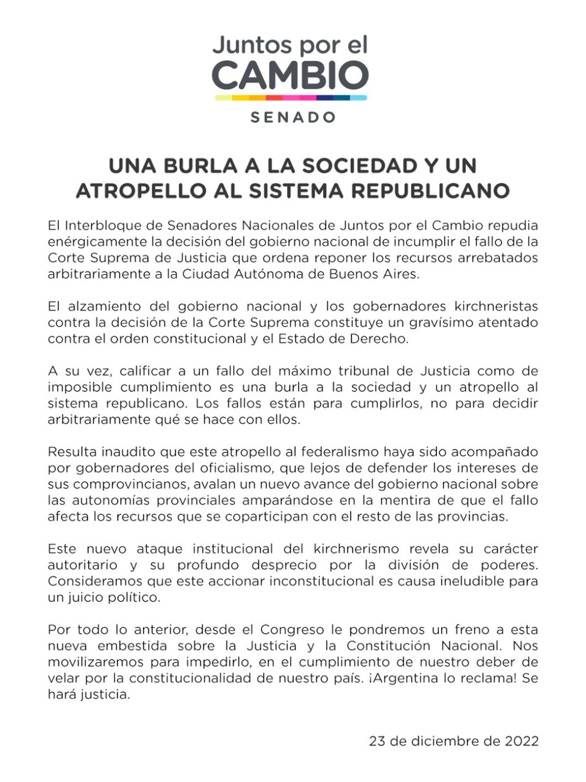 Senadores del interbloque de Juntos por el Cambio emitieron este viernes un comunicado en el que se "repudia enérgicamente la decisión de la Nación de inclumplir el fallo de la Corte Suprema de Justicia que ordena reponer los recursos arrebatados arbitrariamente -de la coparticipación- a la Ciudad Autónoma de Buenos Aires (CABA)".