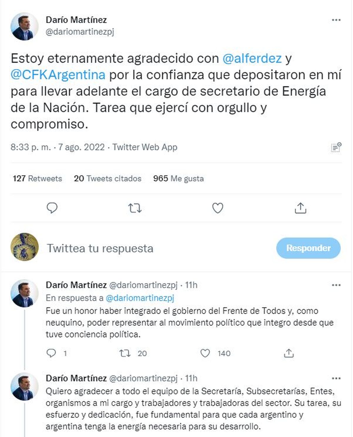 A través de un comunicado, Darío Martínez se despidió y se mostró “eternamente agradecido” con Alberto Fernández y Cristina Kirchner, “por haberme convocado para ejercer el cargo de secretario de Energía de la Nación”.