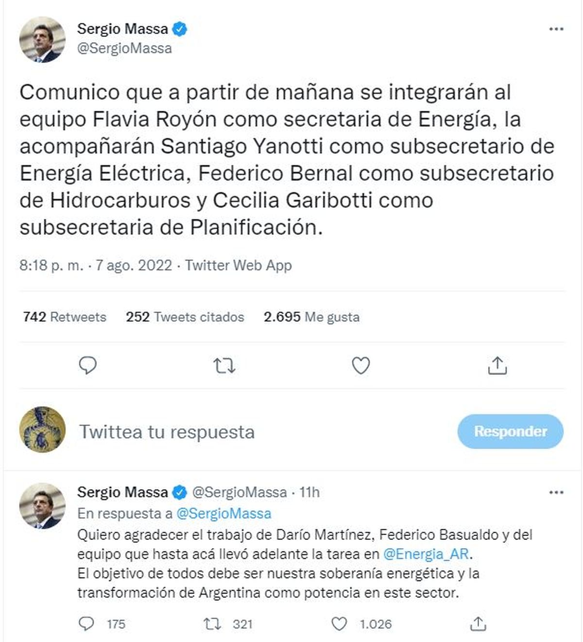 "Comunico que a partir de mañana (por este lunes) se integrarán al equipo Flavia Royón como secretaria de Energía, la acompañarán Santiago Yanotti como subsecretario de Energía Eléctrica, Federico Bernal como subsecretario de Hidrocarburos y Cecilia Garibotti como subsecretaria de Planificación", expresó Massa por medio de su cuenta de la red social Twitter.
