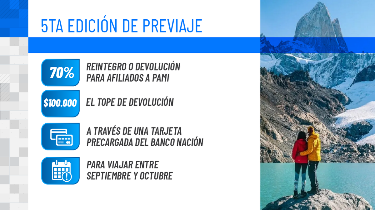 Previaje es un programa de preventa turística que reintegra el 50% del valor de las compras relacionadas con el viaje en créditos. En el caso de personas afiliadas al PAMI, la devolución será del 70%.