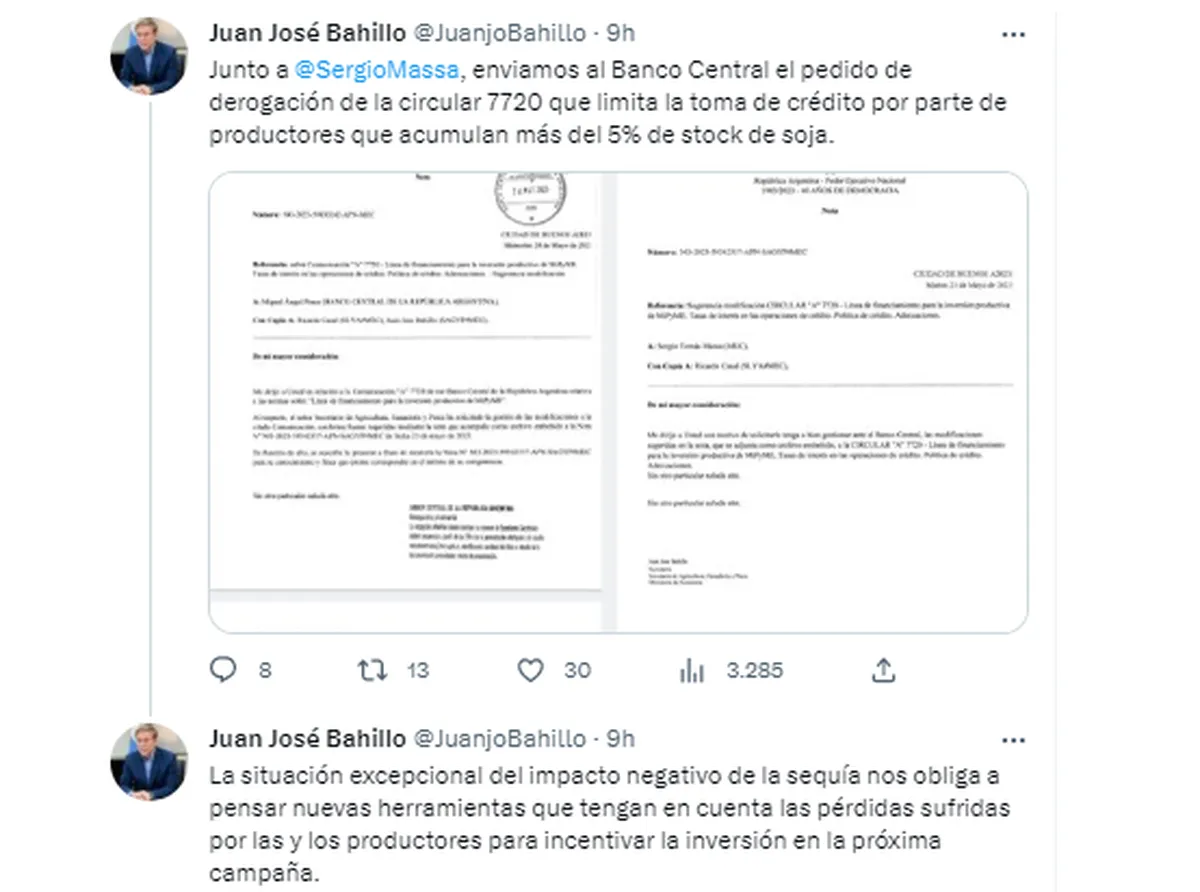 "Junto a @SergioMassa, enviamos al Banco Central el pedido de derogación de la circular 7720 que limita la toma de crédito por parte de productores que acumulan más del 5% de stock de soja", escribió Bahillo en su cuenta de Twitter.