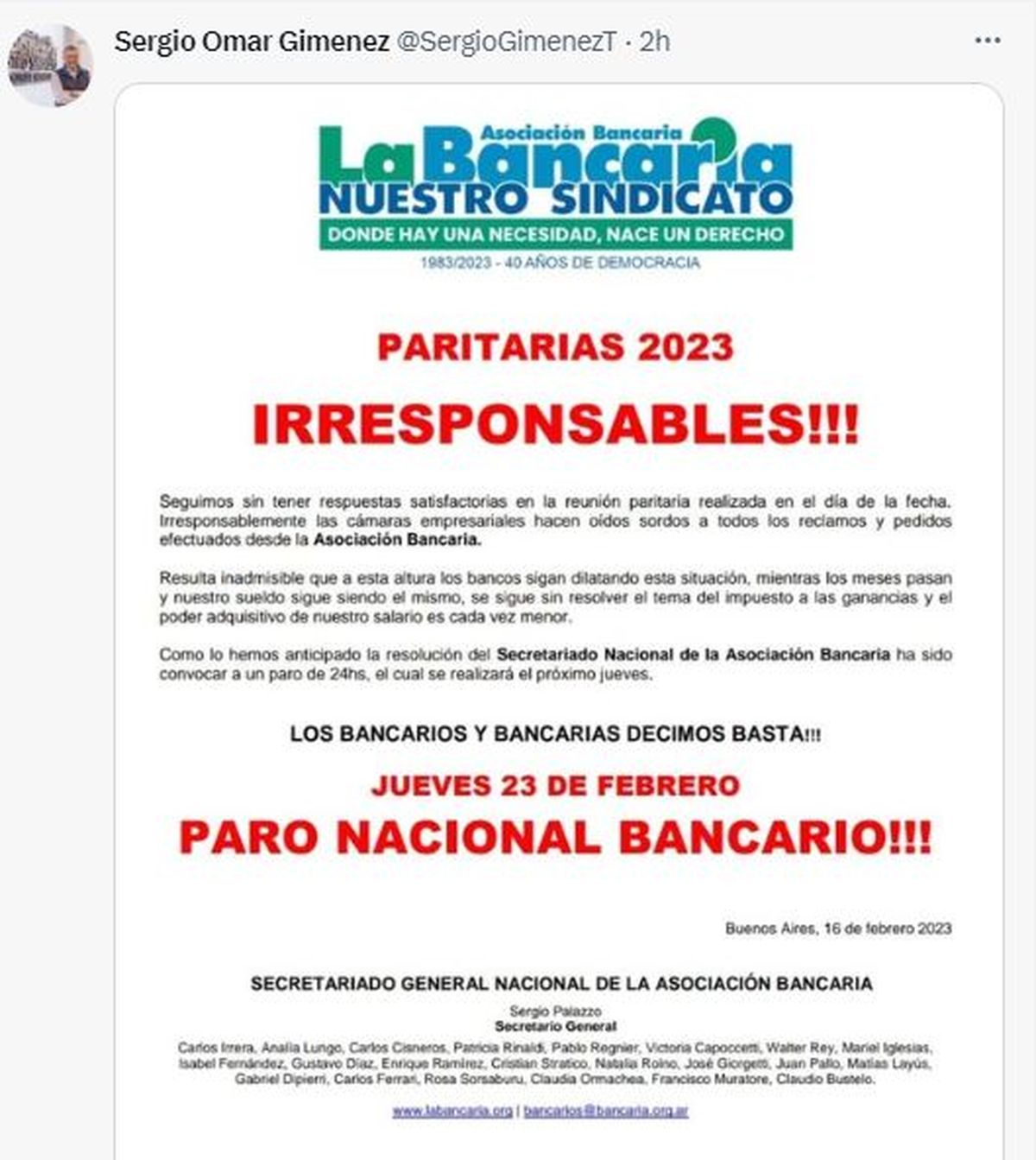 En el comunicado donde ratificaron la medida, desde el sindicato indicaron que "seguimos sin tener respuestas satisfactorias en la reunión paritaria realizada en el día de la fecha", acusando que "irresponsablemente las cámaras empresariales hacen oídos sordos a todos los reclamos y pedidos efectuados desde la Asociación Bancaria".