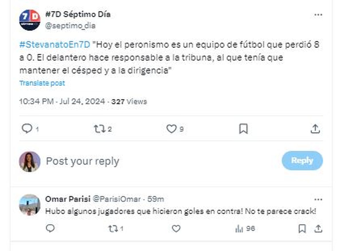 Tanto es así, que el mismo Parisi recogió el guante y hasta le dedicó un posteo en X. El ex candidato a gobernador respondió a un tuit de Séptimo Día que reproducía los dichos del intendente maipucino sobre el partido que habían perdido 8 a 0 e ironizó: "Hubo jugadores que hicieron goles en contra. No te parece crack".