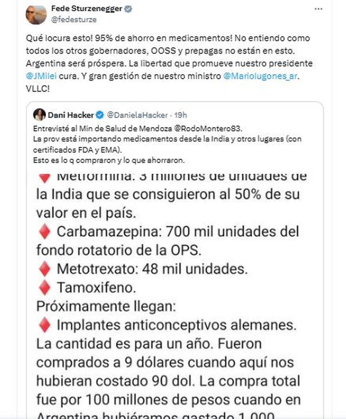 Tras ese posteo, Sturzenegger salió a ponderar otra vez la decisión de la gestión de Cornejo de avanzar con esas importaciones lo que termina impactando en un enorme ahorro para el Estado. Según su posteo ese ahorro es del 95%.