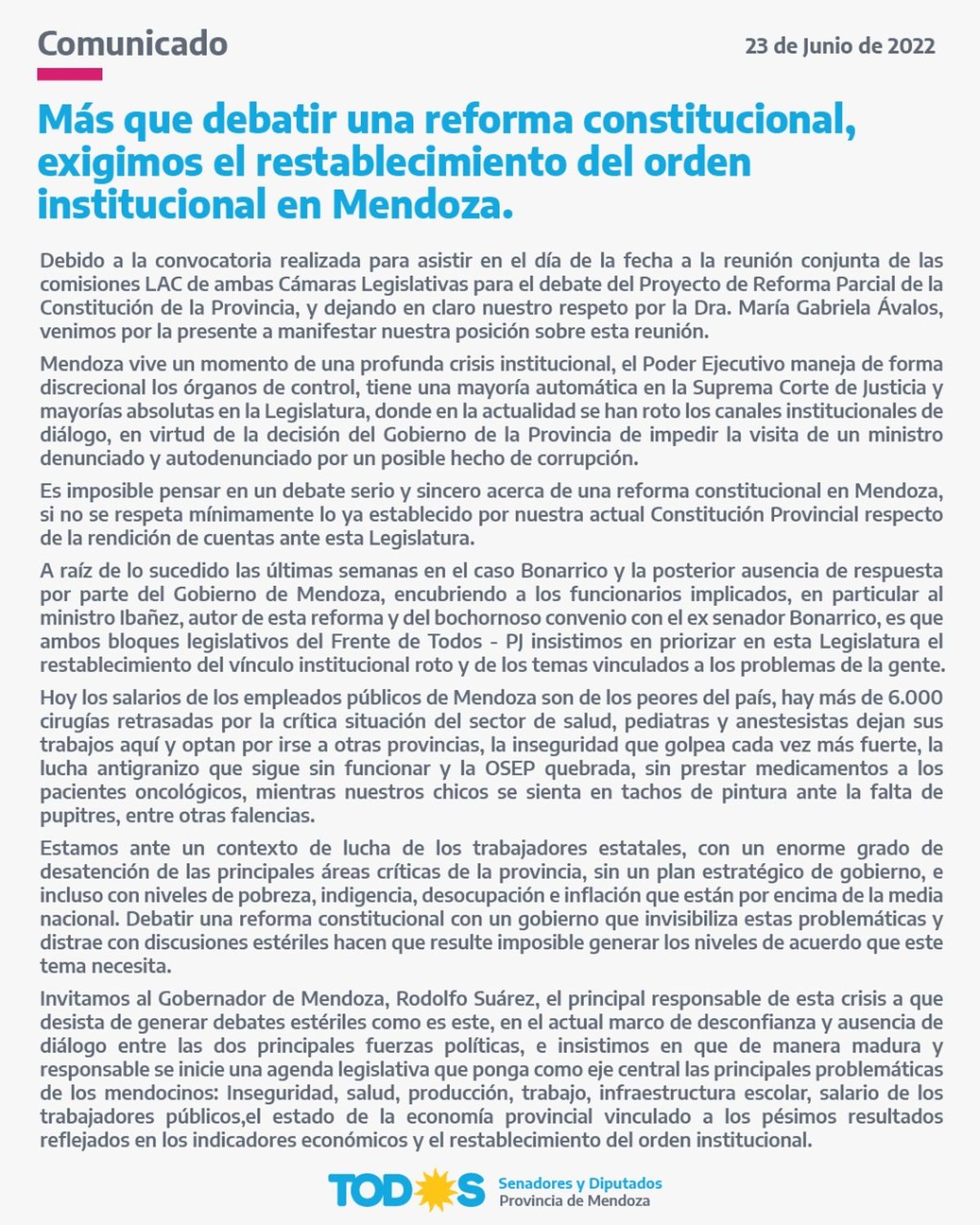 "El Poder Ejecutivo maneja de forma discrecional los órganos de control, tiene una mayoría automática en la Suprema Corte de Justicia y mayorías absolutas en la Legislatura, donde en la actualidad se han roto los canales institucionales de diálogo, en virtud de la decisión del gobierno de la provincia de impedir la visita de un ministro denunciado y autodenunciado por un posible hecho de corrupción", rezaba el texto que publicó el Frente de Todos.